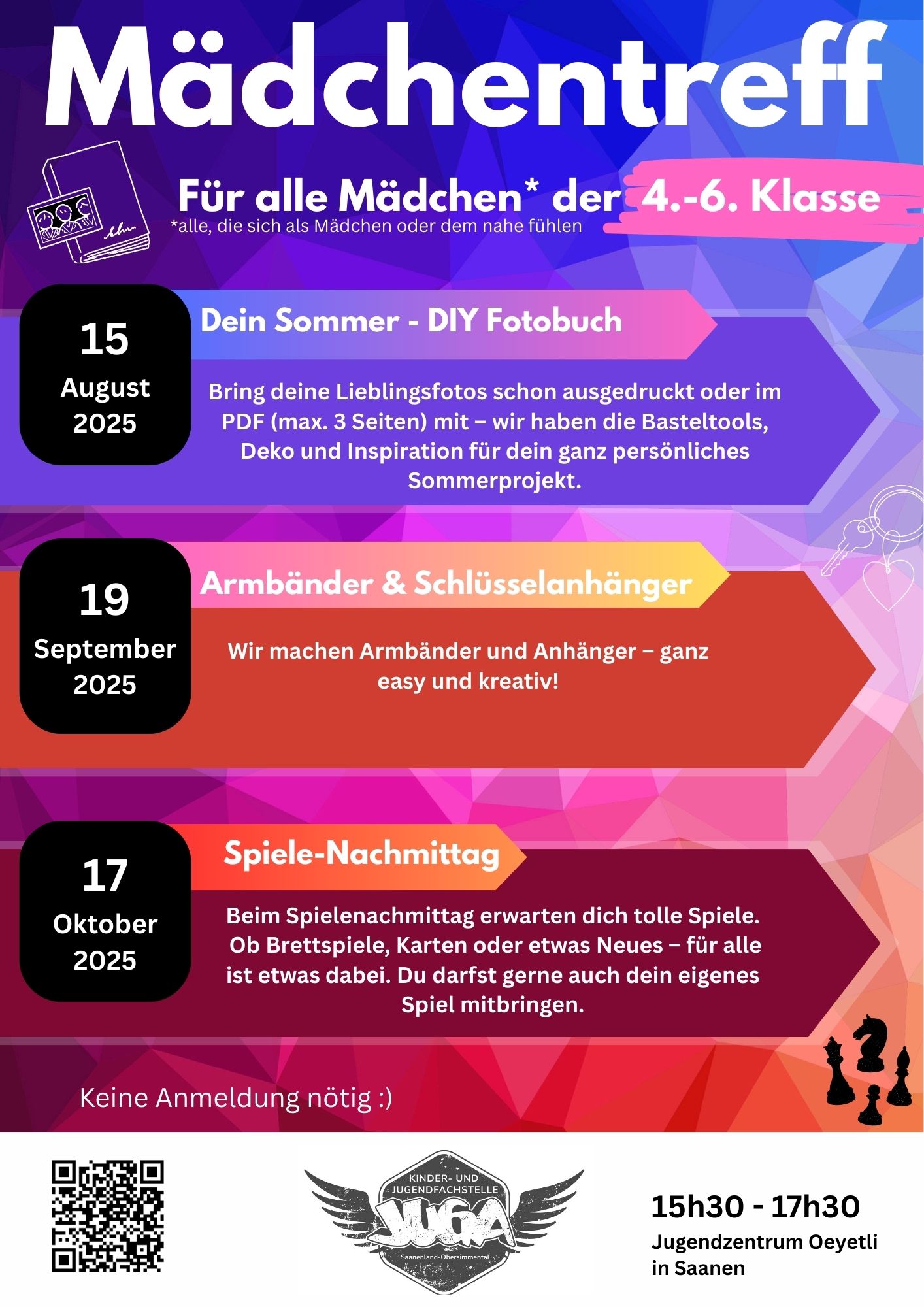 Der Mädchentreff richtet sich an alle Mädchen* von der 4. bis zur 6. Klasse und findet monatlich während zwei Stunden im Oeyetli statt.