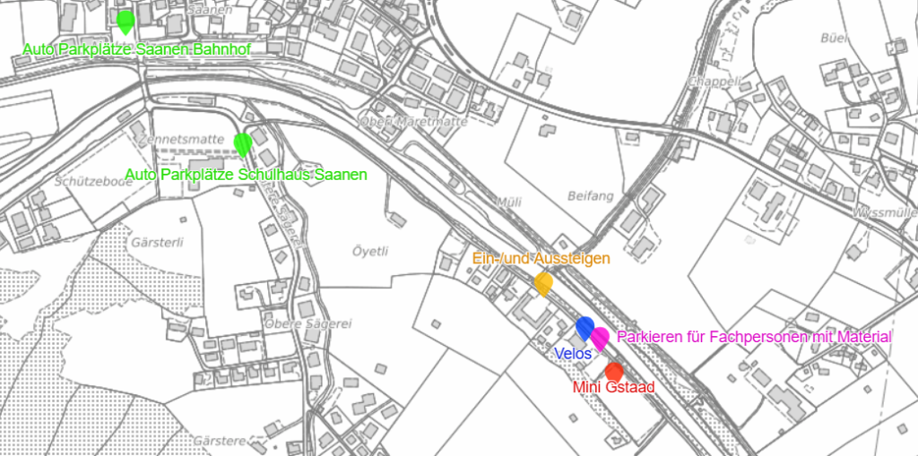 Parkplätze sind beim Bahnhof Saanen und beim Schulhaus Saanen.